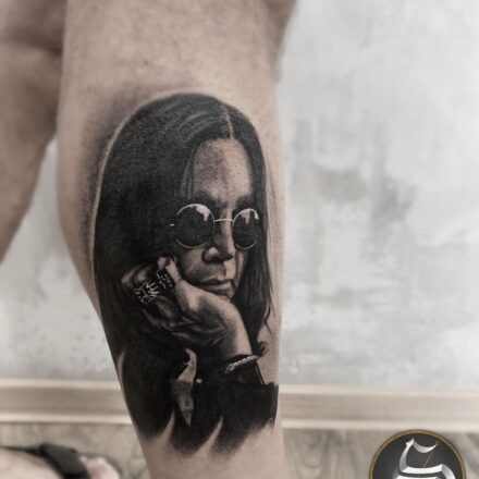 Hudební tetování, osobnosti, portrét, Viktor Sheen s nápisy na lýtku