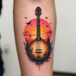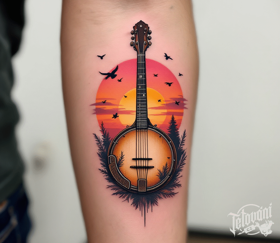 Hudební tetování, předměty, banjo a západ slunce na předloktí