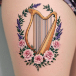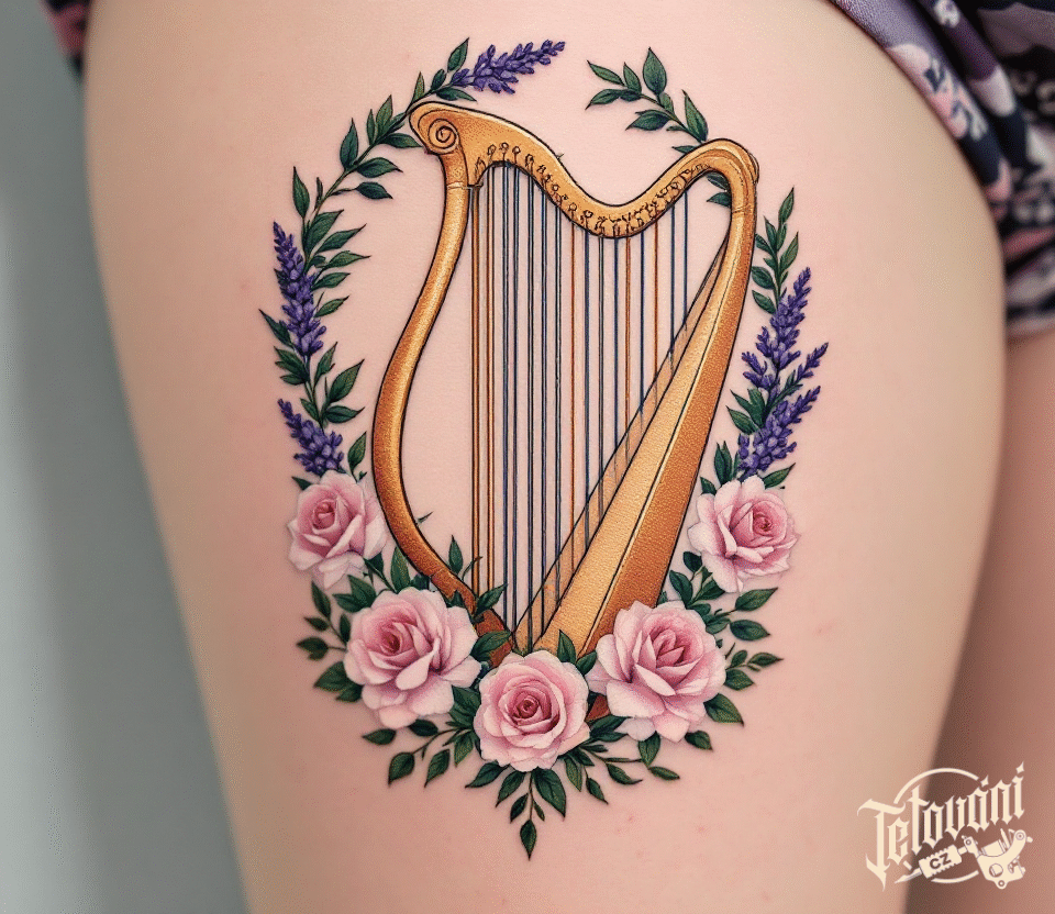 Hudební tetování, předměty harfa na stehně