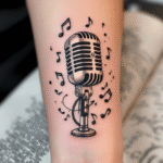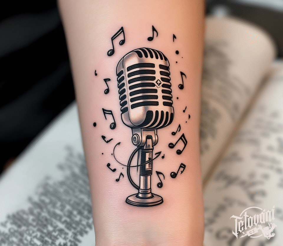 Hudební tetování, předměty, mikrofon a noty na předloktí