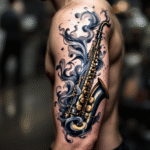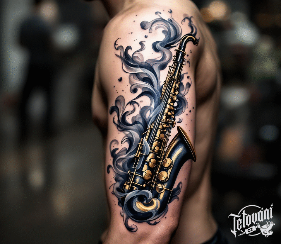 Hudební tetování, předměty, saxofon na rameni