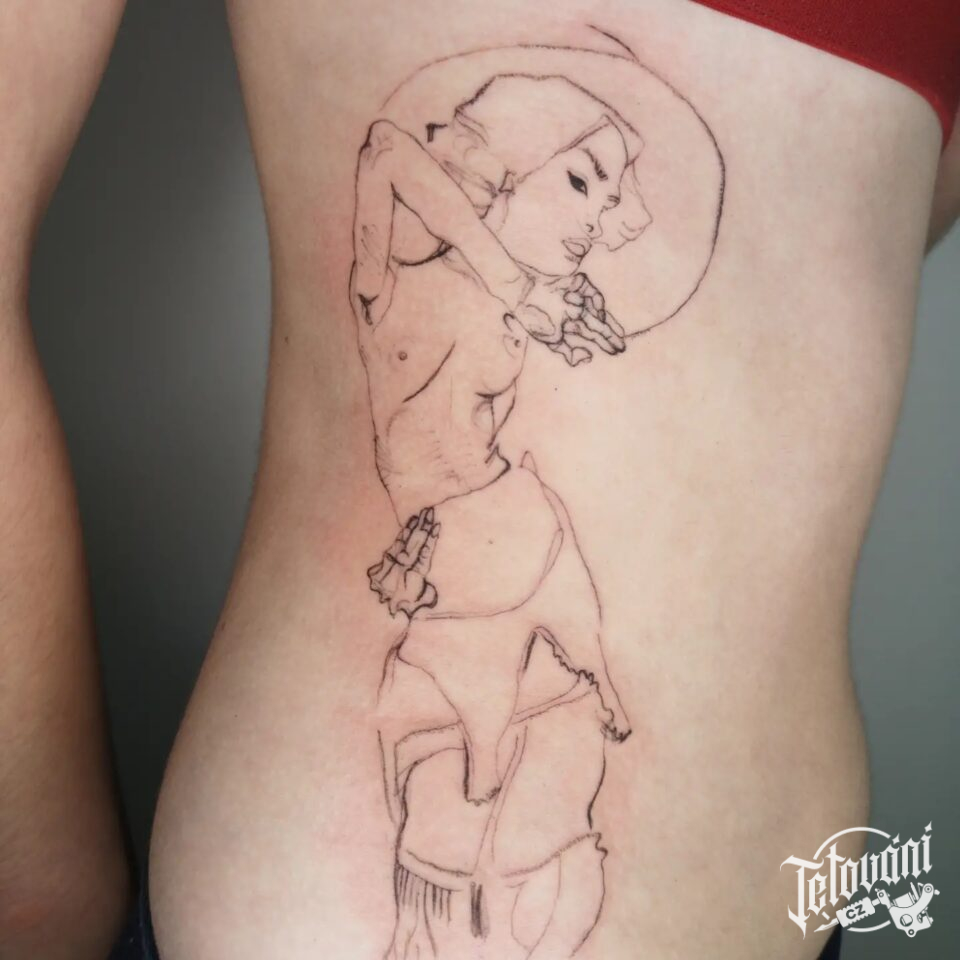 Jemné tetování symboly, žena na bok žeber