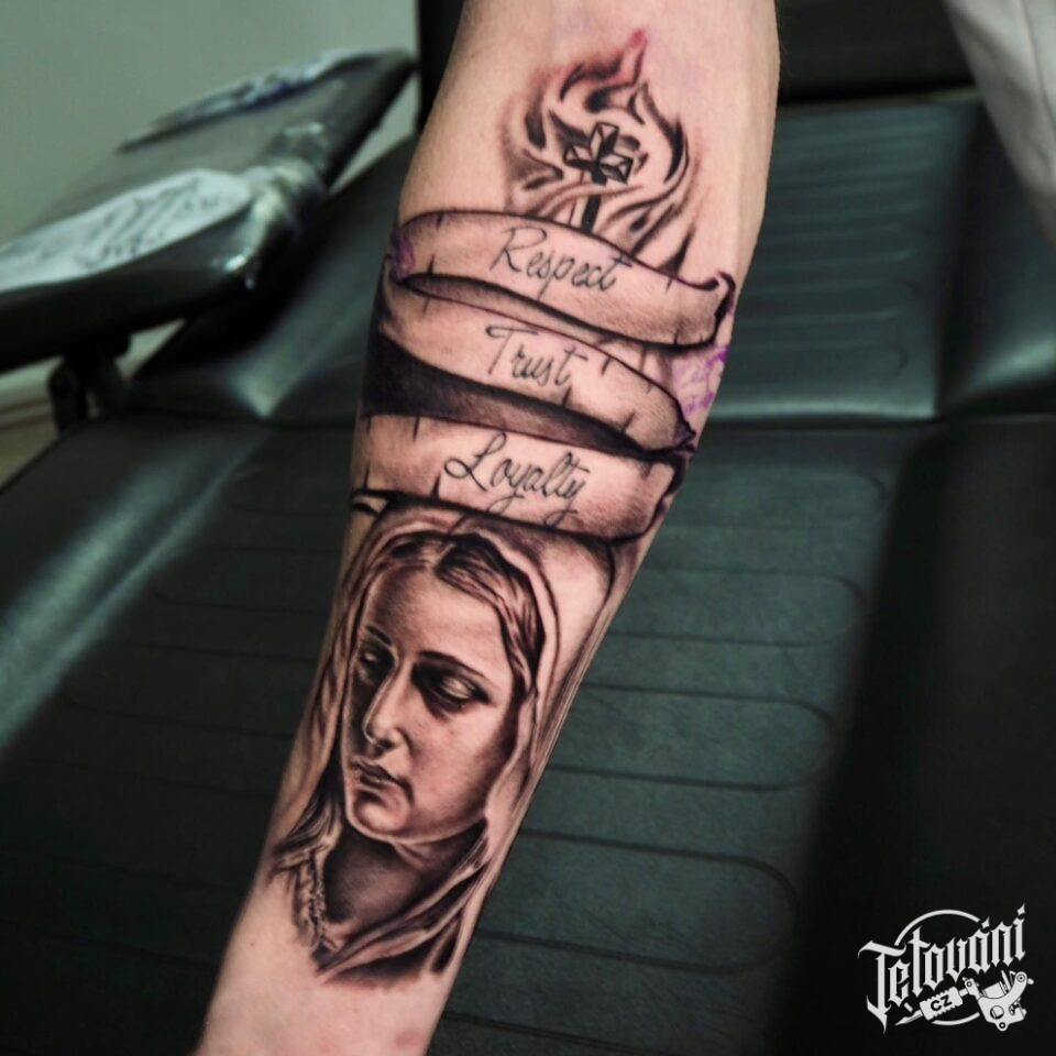 Křesťanské tetování, náboženství, Panna Marie a nápisy na předloktí