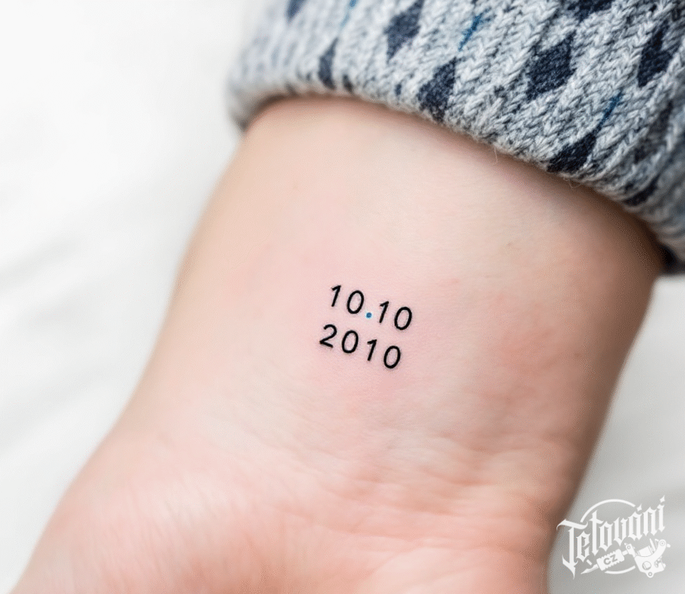 Malé tetování nápis, datum narození na předloktí
