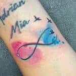 Minimalistické tetování nekonečno, ležatá osmička, symbol, jméno na předloktí