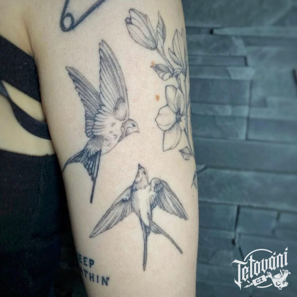 Minimalistické tetování vlaštovky, květiny symbol lásky na rameno