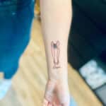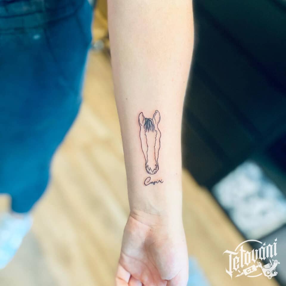 Minimalistické, vzpomínkové tetování znaky a symboly, čáry, kůň se jménem na předloktí