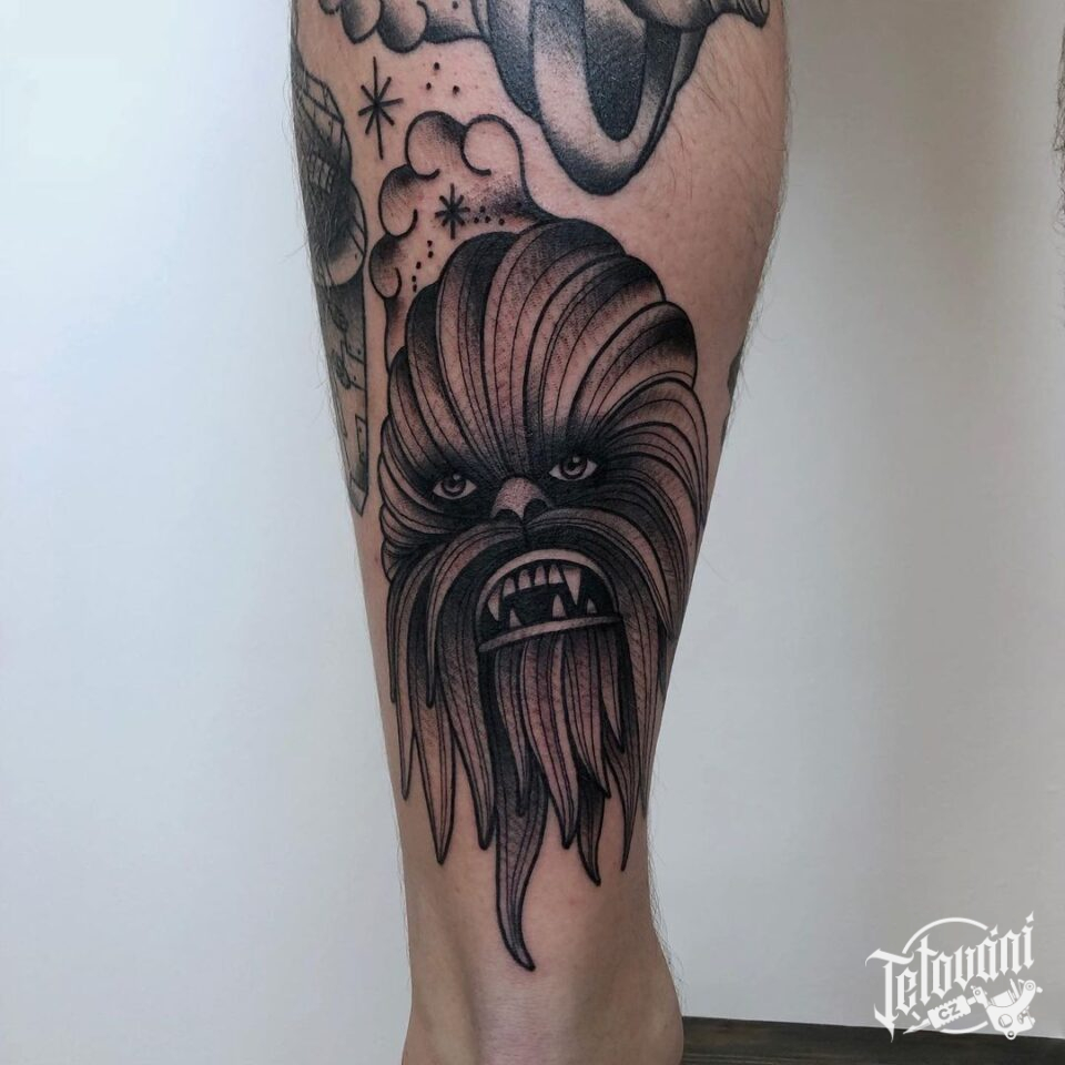 Neo traditional tetování z filmů a pohádek Star Wars, portrét na holeň