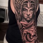 Portréty bojovník a žena, znaky a symboly lev, zvíře had na rameno