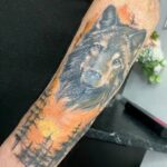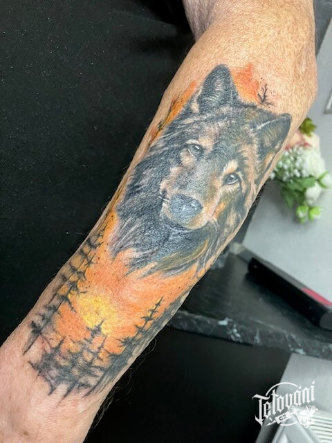 Realistické barevné tetování na předloktí – vlk a les