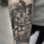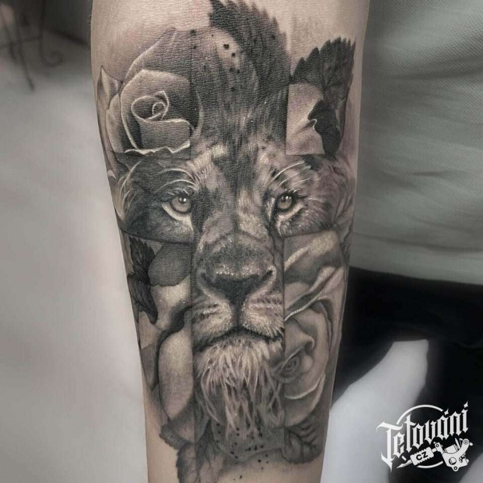 Realistické tetování lva a růže – na předloktí