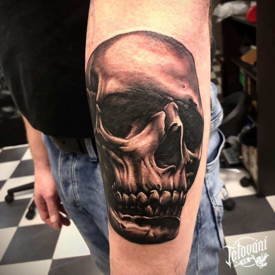 Realistické tetování portrét, lebka na předloktí