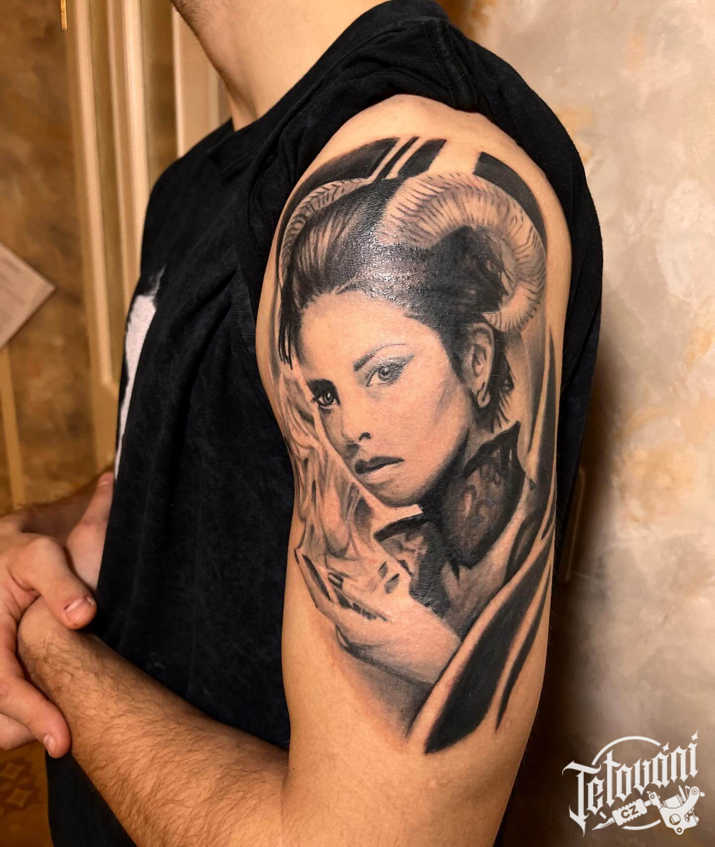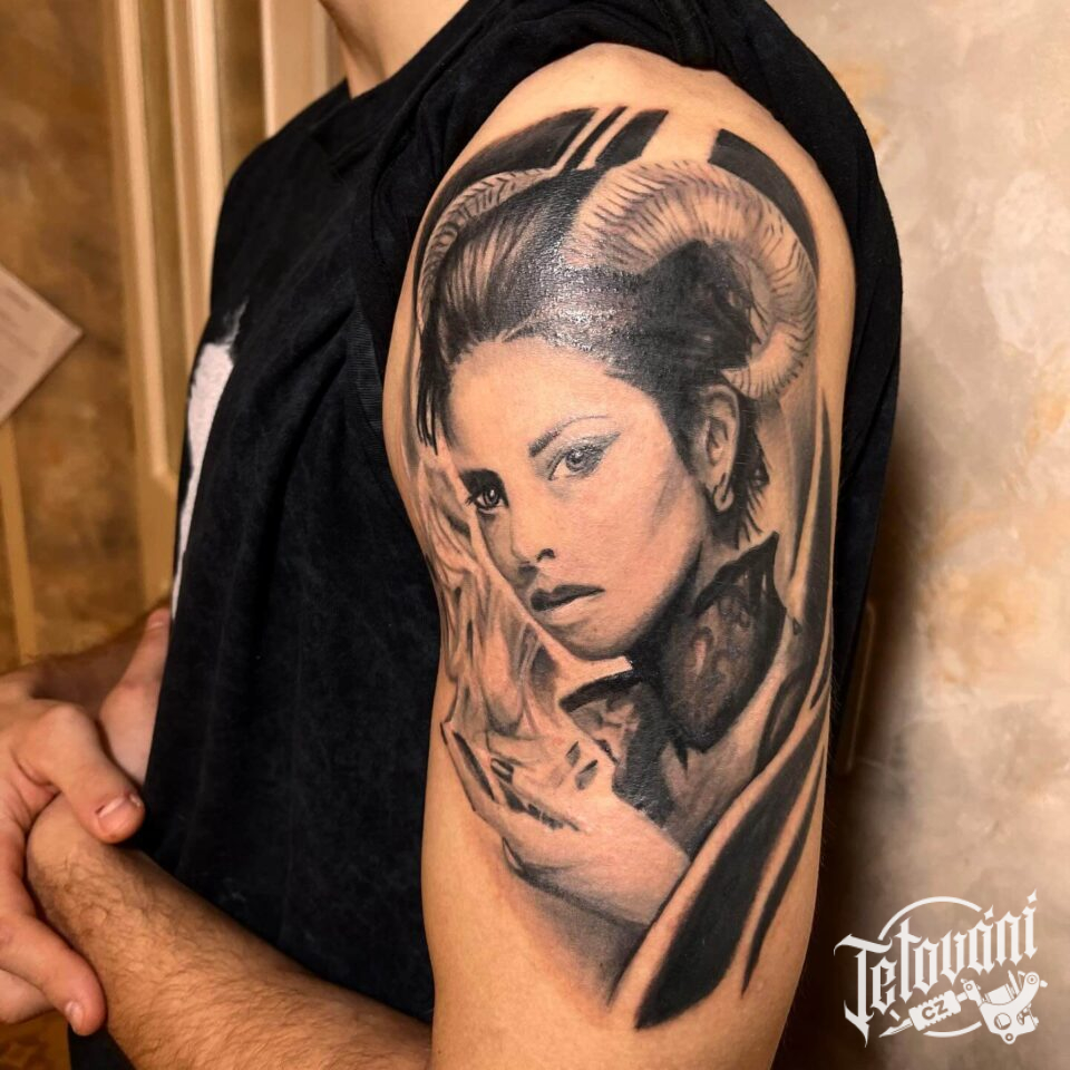 Realistické tetování ženy s rohy na paži