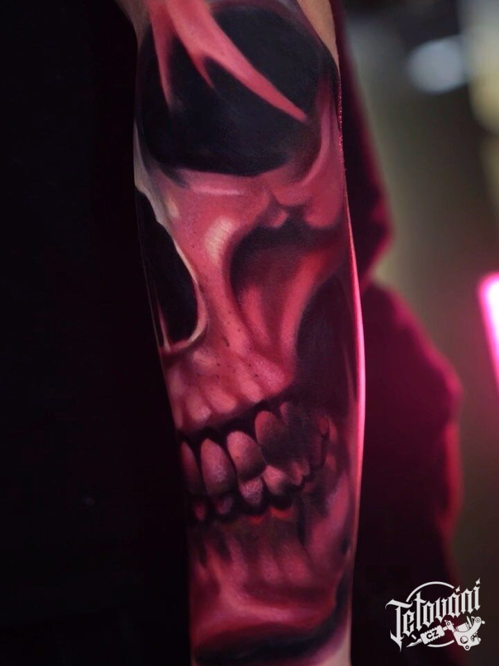 Realistika, tetování lebky na předloktí