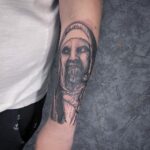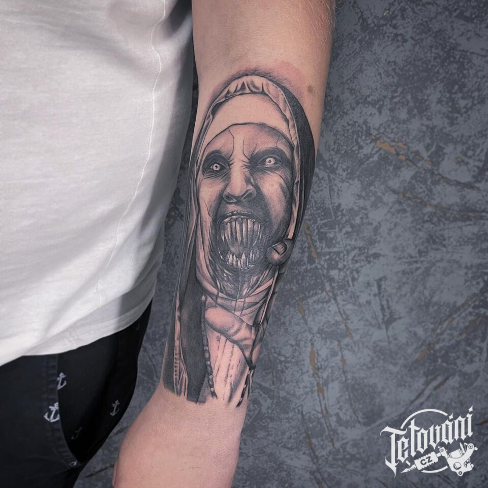 Realistika, tetování náboženství – jeptiška na předloktí