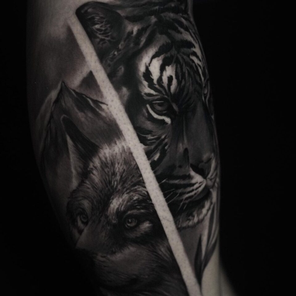 Realistika, tetování zvířata, vlk a tygr na rameno