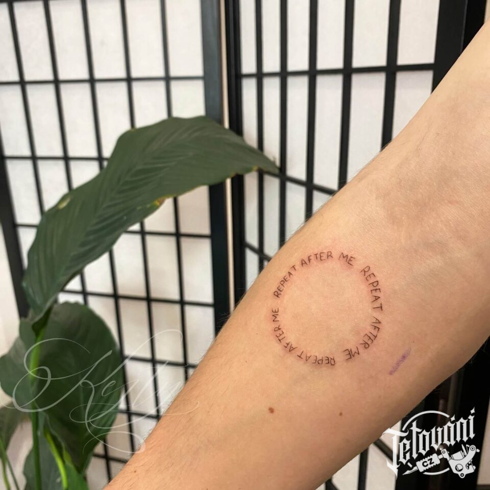 „Repeat after me“ nápis do kruhu na předloktí