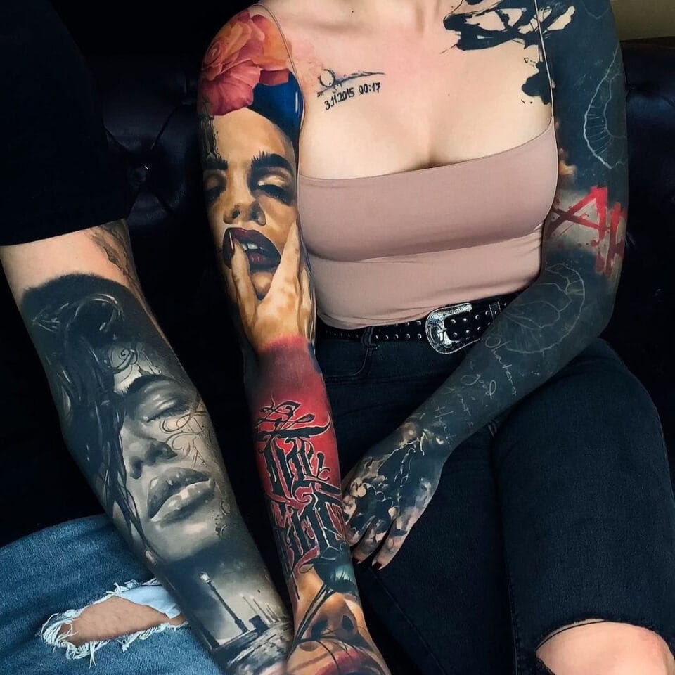 Rukáv s nápisy a portrétem ženy