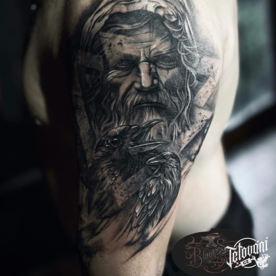 Severská tetování, portrét, keltský druid a havrani na rameni