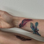 Společná tetování, pírka a zvíře vážka na předloktí