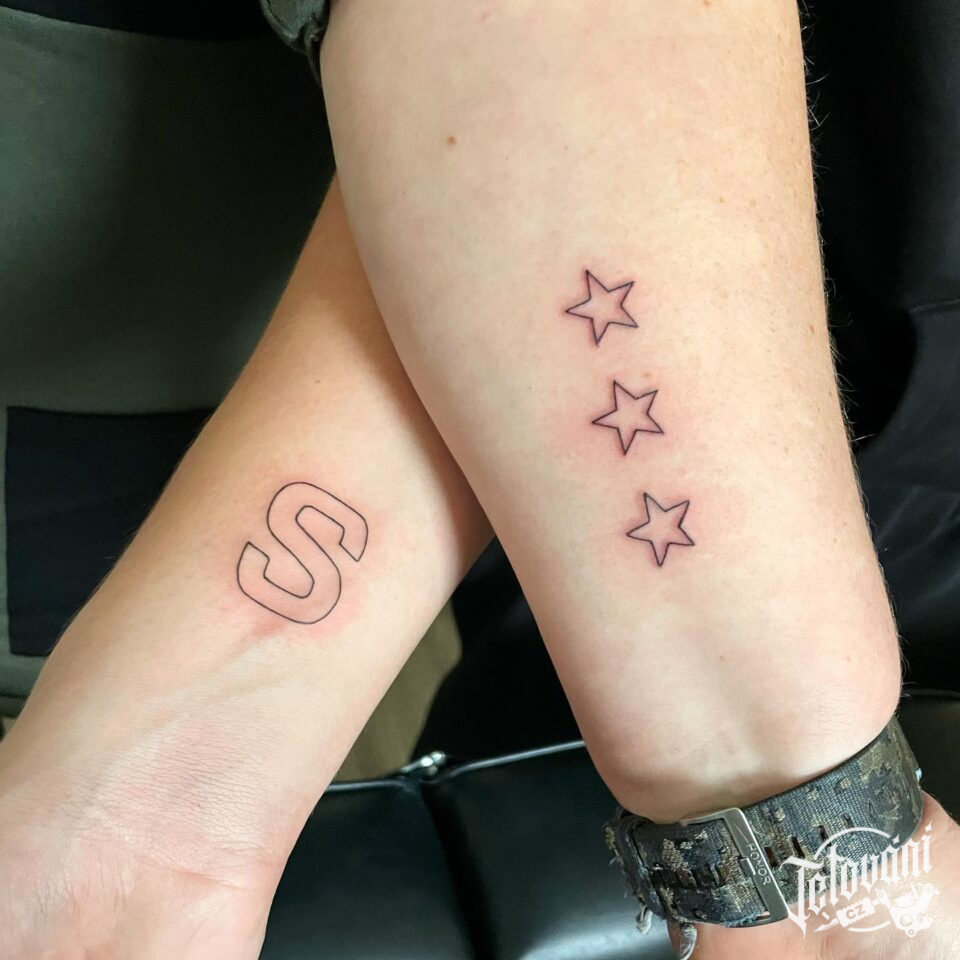 Společná tetování písmeno a hvězdy, nápisy na předloktí