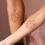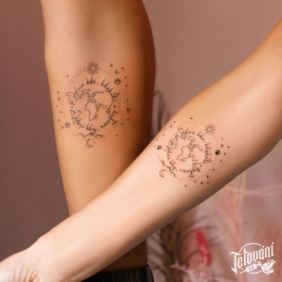 Společná tetování, planety, symbol cestování na předloktí