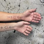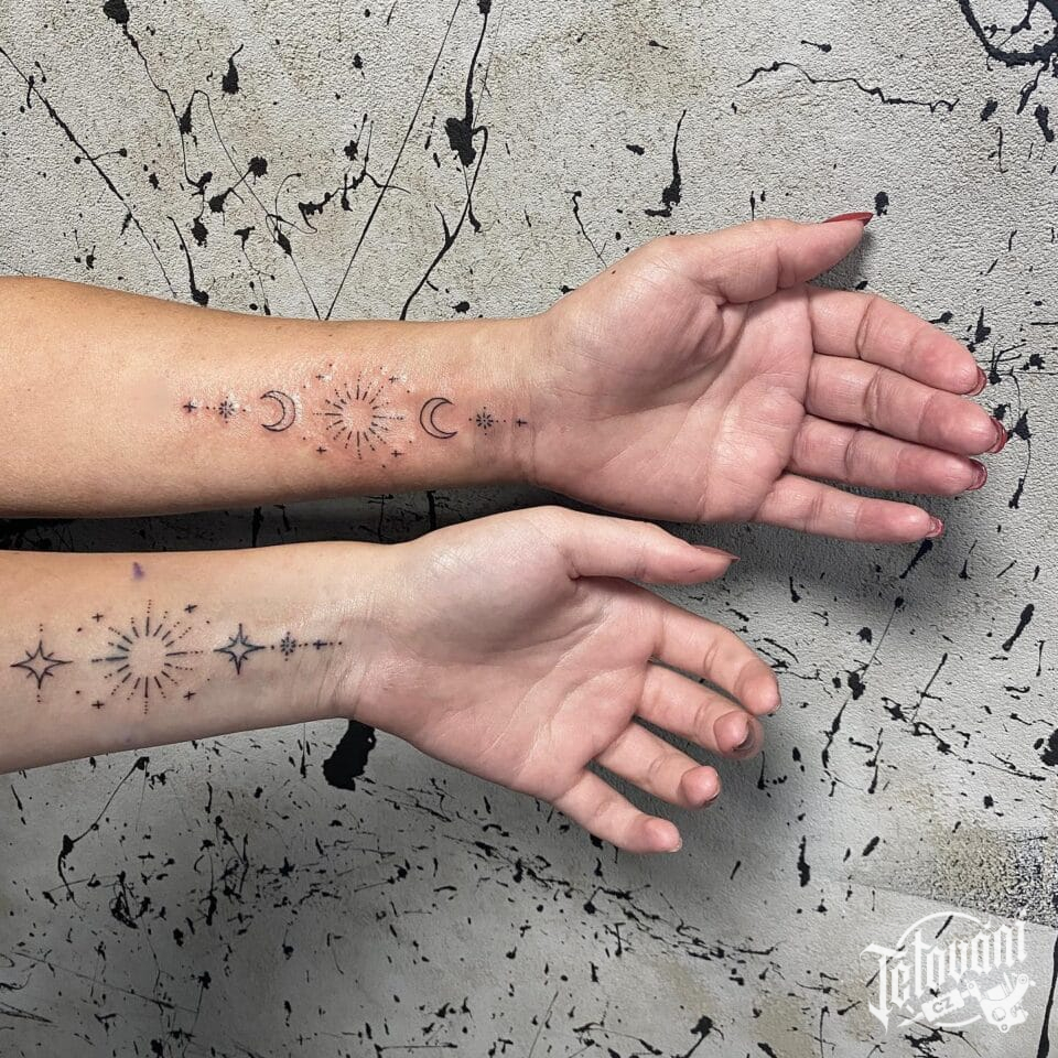 Společná tetování pro kamarádky, měsíc, slunce, ornamenty na předloktí