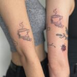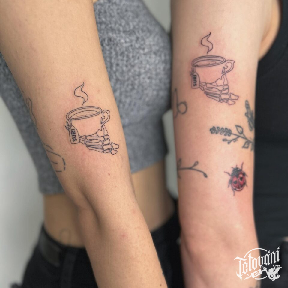 Společná tetování pro kamarádky, pro sestry, ruce s šálky na rameni