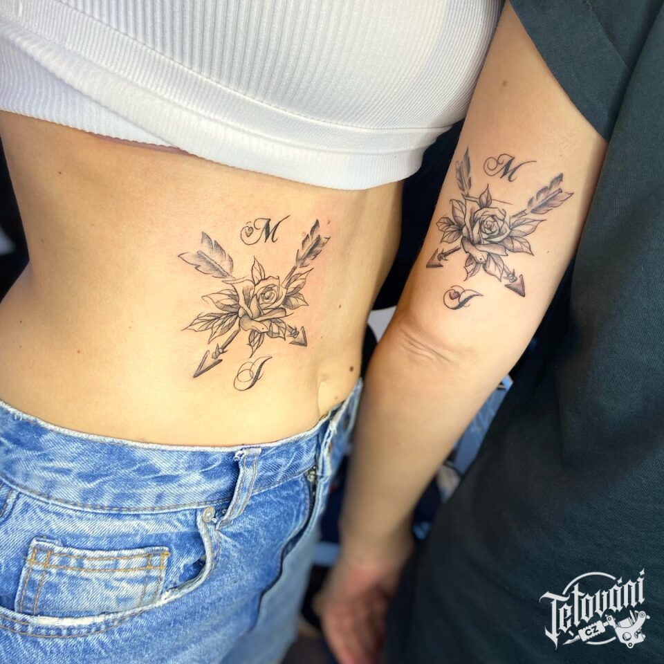 Společná tetování pro kamarádky, růže s písmeny a s šípy na ruce