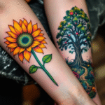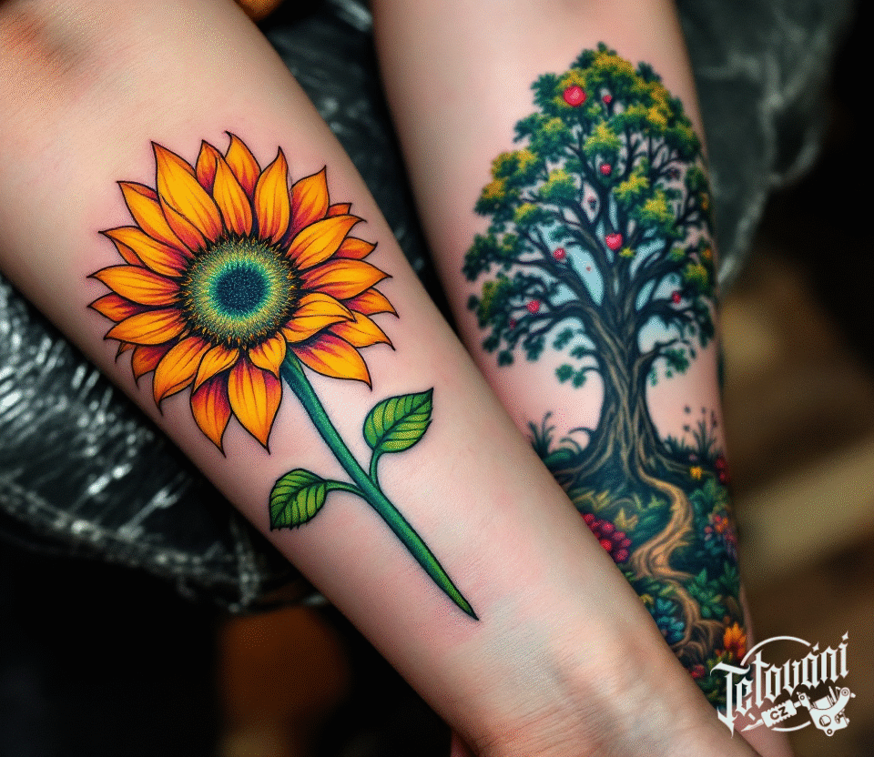 Společná tetování pro manžele, slunečnice a strom na předloktí