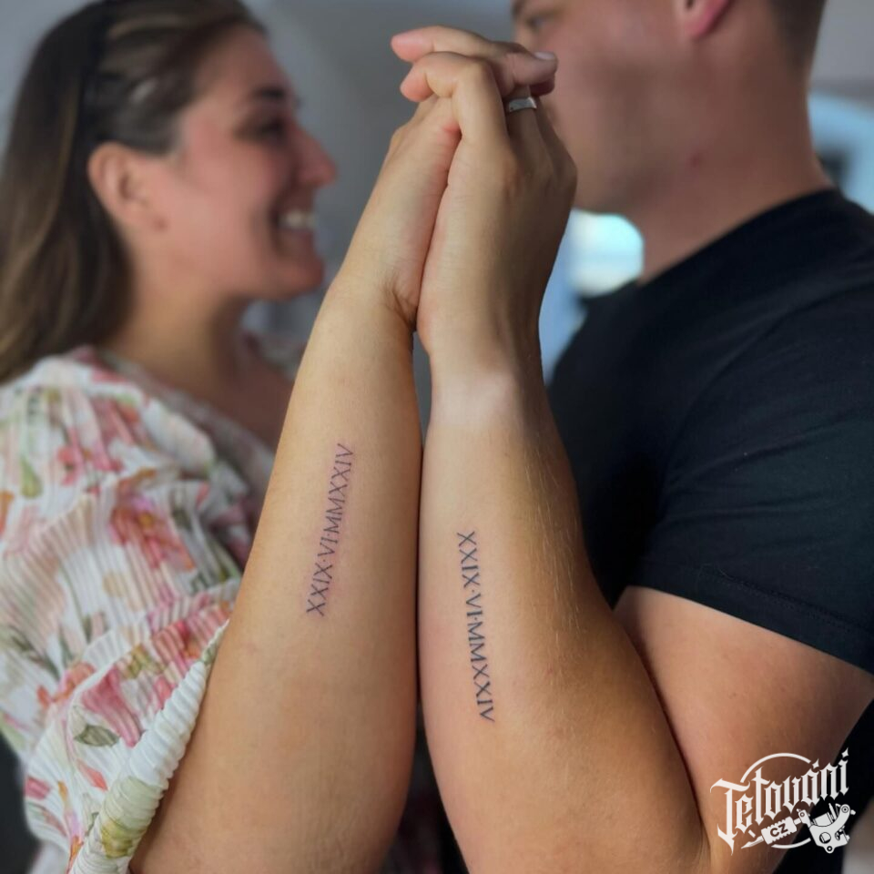 Společná tetování, pro páry, nápisy, čísla, datum na předloktí