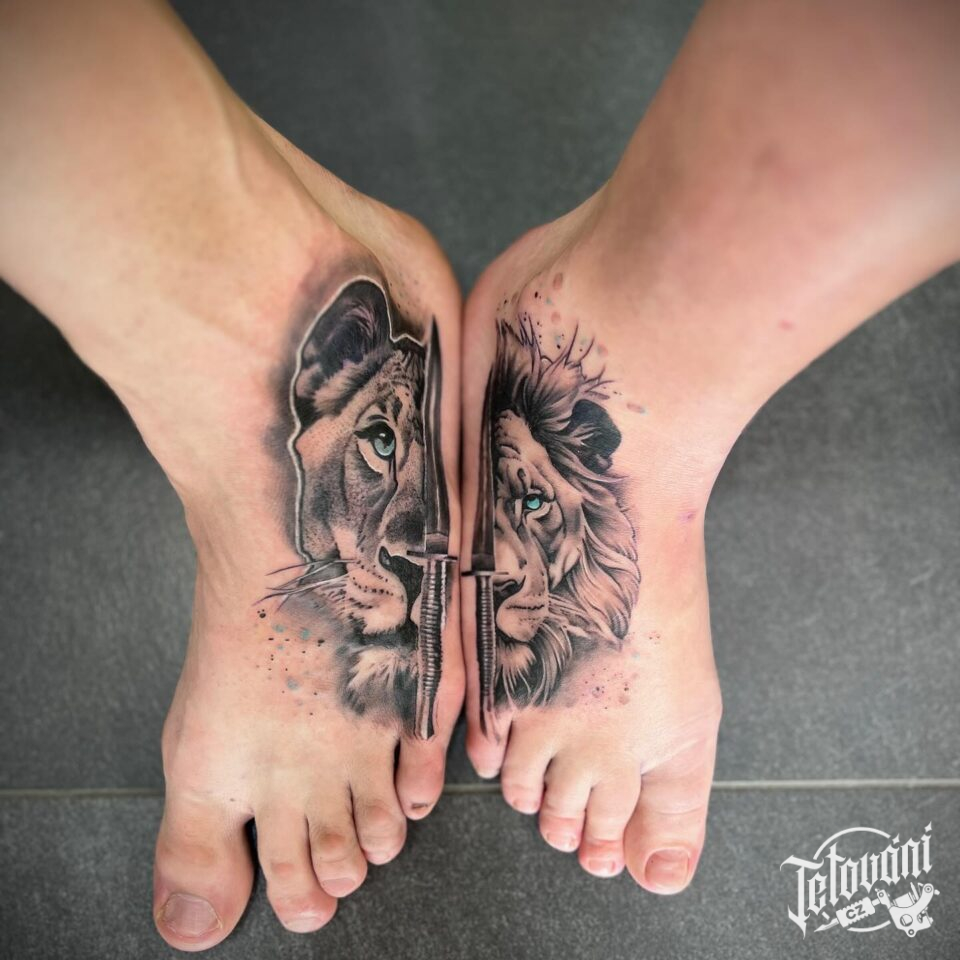 Společná tetování symbol rodiny, zvířata lev a lvice na nárt