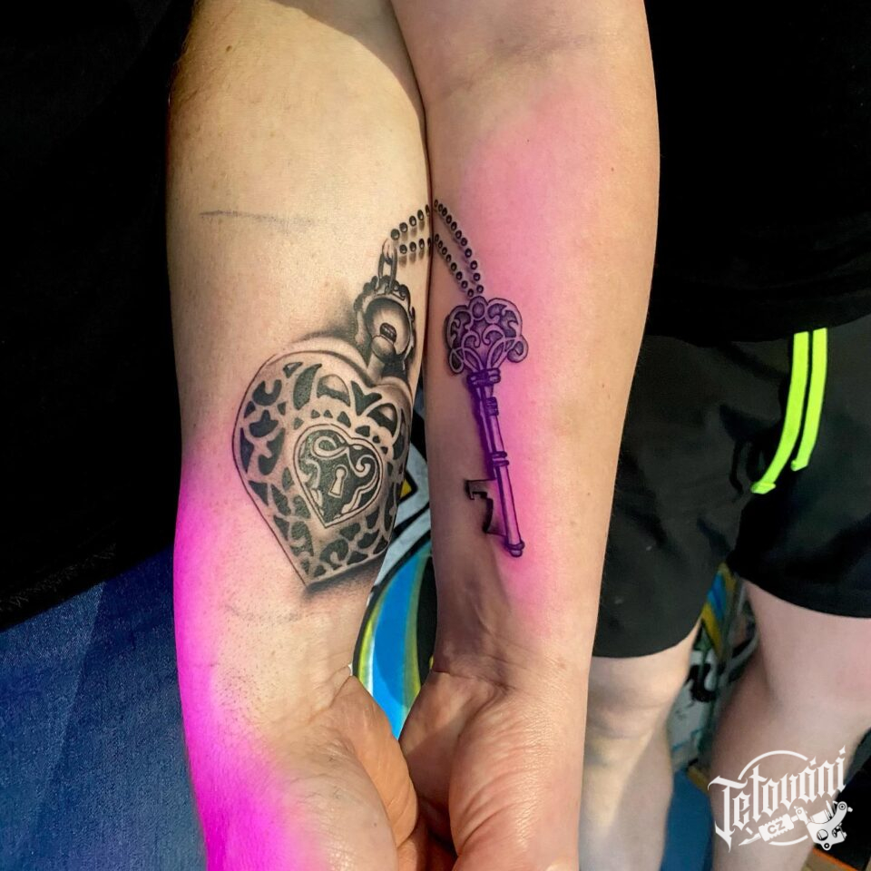 Společná tetování zámek a klíč na předloktí