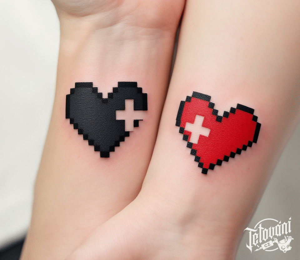 Společné tetování černé a červené srdce pro páry, symbol lásky na ruku