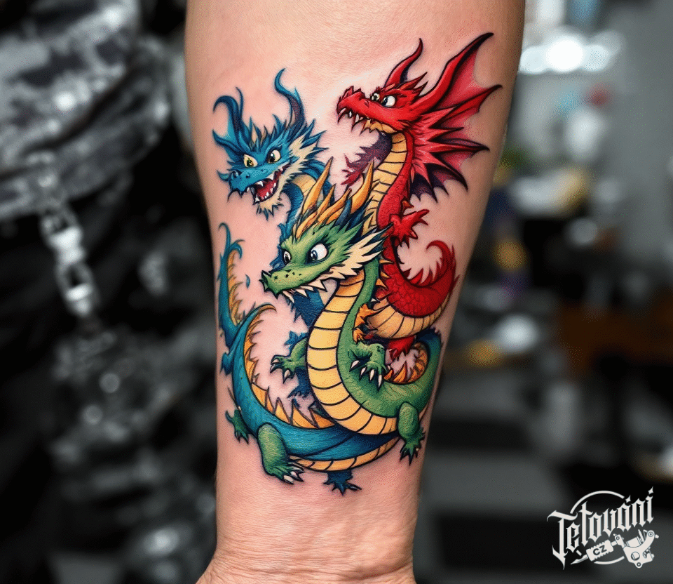 Společné tetování pro tři, mýtické bytosti, draci na předloktí