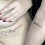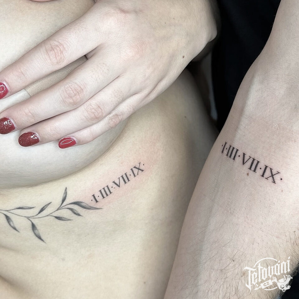 Společné tetování římské čísla, datum narození, nápis, písmena pod prsa a na předloktí
