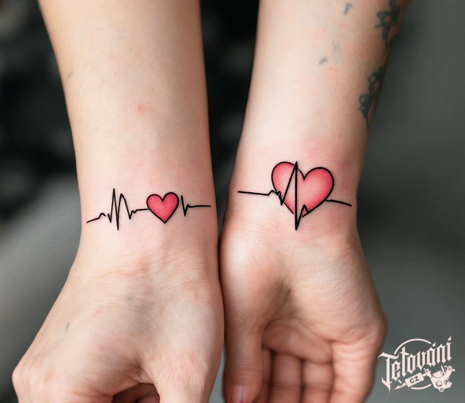 Společné tetování srdce a tep srdce, pro páry jako symbol lásky na předloktí
