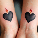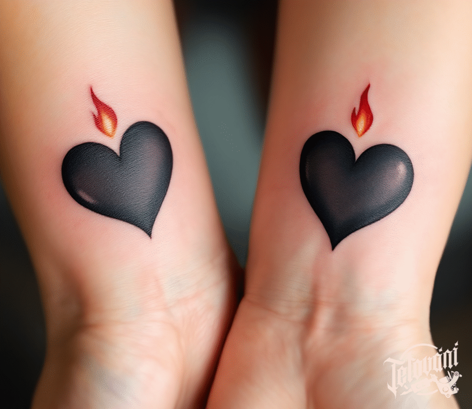 Společné tetování symbol lásky, černé srdce a oheň na předloktí