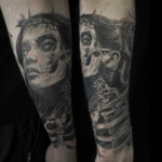 Surrealistický tetování ženy s obličejem lebky na předloktí