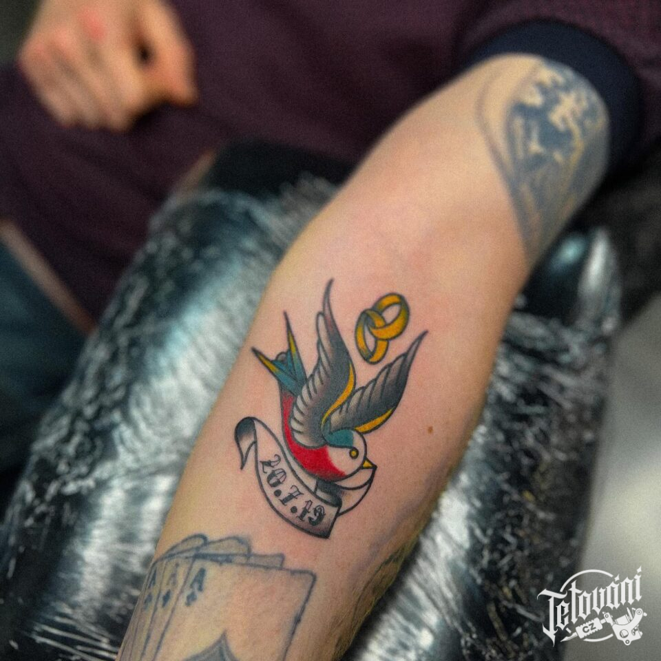 Svatební tetování holubice, česká vlajka, datum, prsteny na předloktí