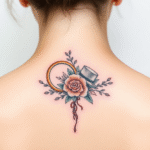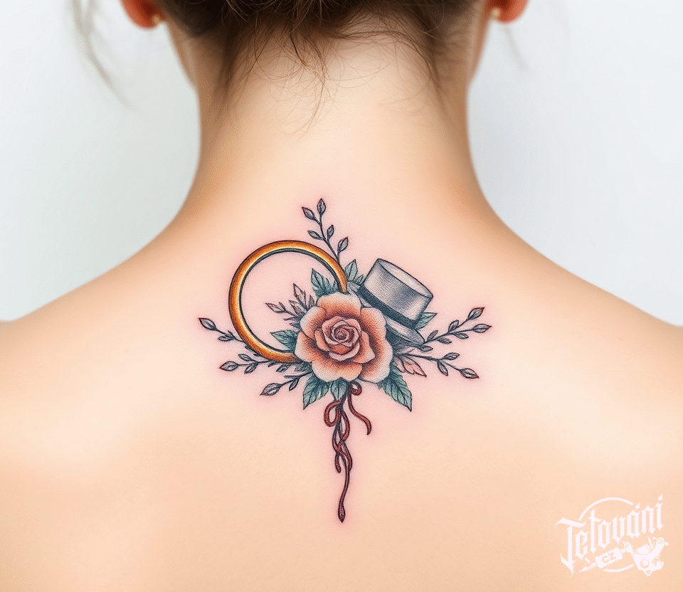 Svatební tetování snubní prsten, růže na zádech