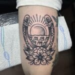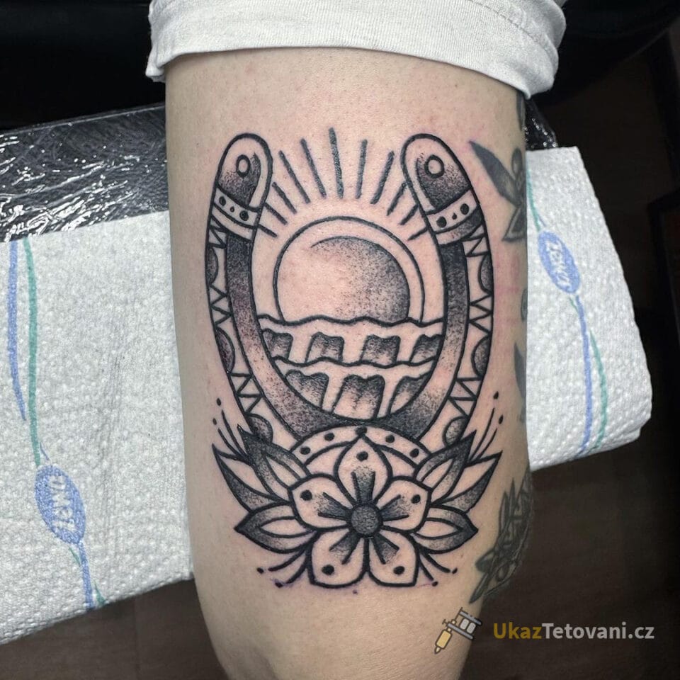 Symbol štěstí podkova s květinou a sluncem na ruce