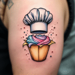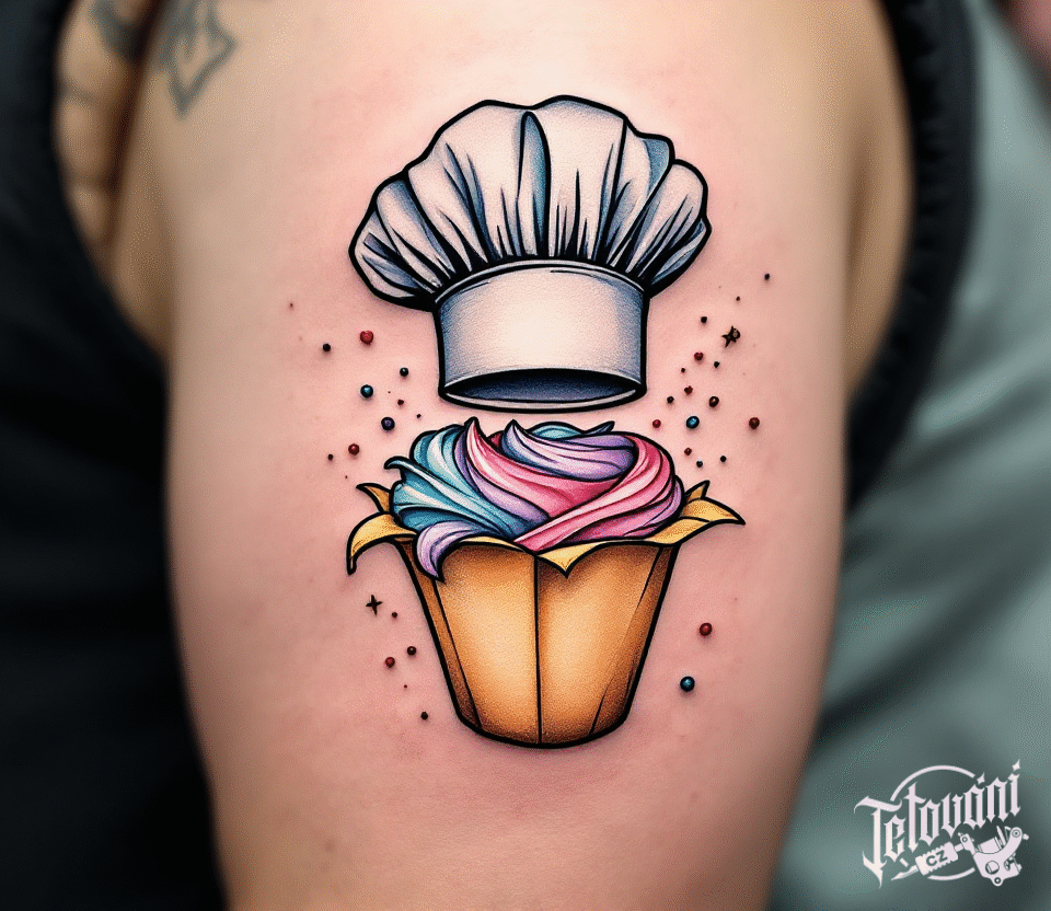 Tetován kuchařská čepice a muffin na rameno