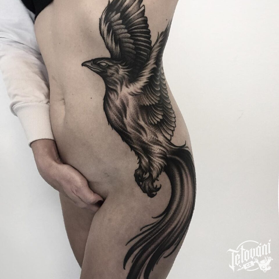 Tetování mýtické bytosti, fénix na stehnu