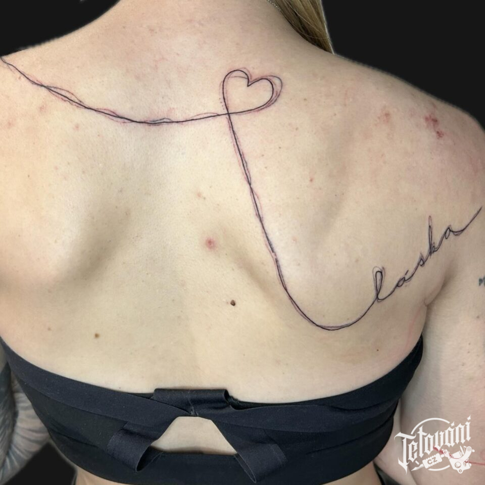 Tetování abstraktní čára srdce a nápis láska na zádech