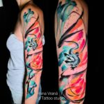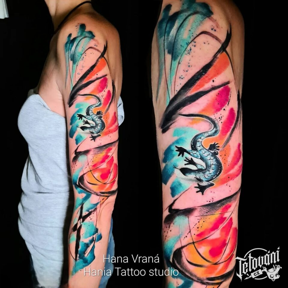Tetování abstraktní čáry a ještěrka, rukáv