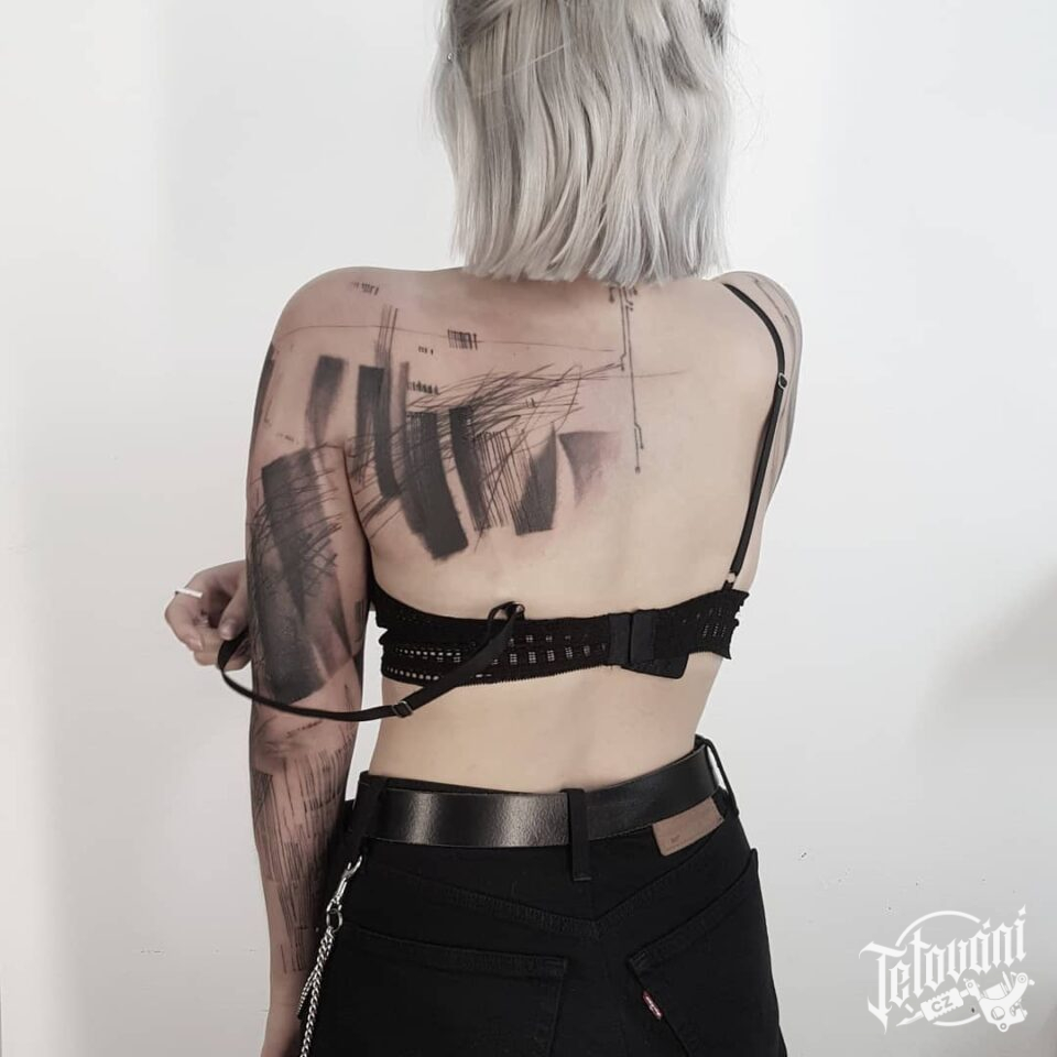 Tetování abstraktní čáry a pruhy na rukávu a lopatce