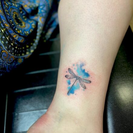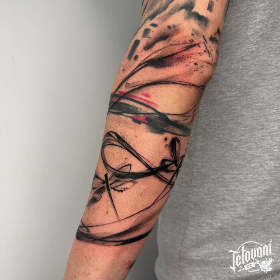 Tetování abstraktní čáry a zvíře vážka na ruku