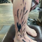 Tetování abstraktní čáry, květiny a srdce na lýtku