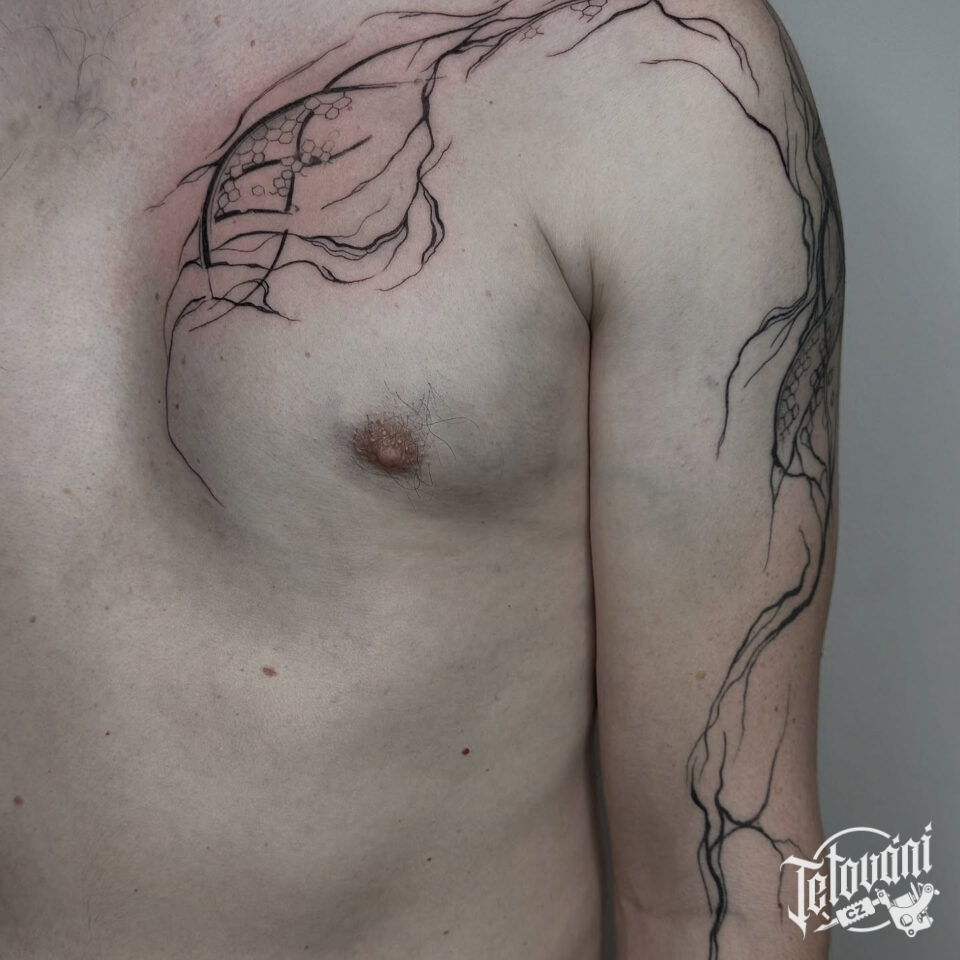Tetování abstraktní čáry na ruku a prsa